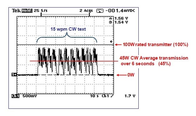 In the second example, a Morse Code (CW) transmission was tested and the average output of the 100W transmitter fell to an average of 45W, or a duty cycle of only 45% while the characters were actually being sent.