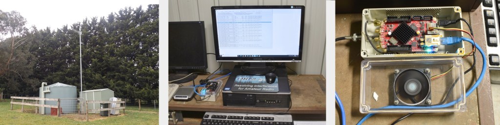 The VK3RASA receiver hardware is located in a shed, away from domestic interference sources. A receive station consists of a Red Pitaya multi-channel HF software defined receiver, a power supply, a dedicated PC and a live internet connection to the rest of the world.