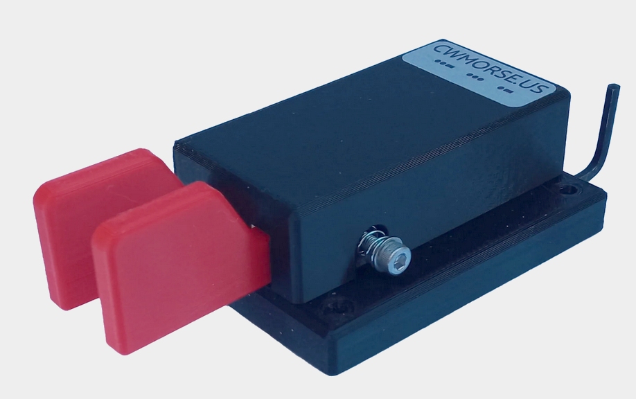 Many operators no longer use a ‘straight’ Morse key as shown at the top of this page, preferring to use a side paddle key where pressing one paddle generates a steady stream of ‘dit’s’ and the other paddle for the ‘dah’ elements. More consistent transmission quality is attainable with this method. A low-cost plastic paddle key is shown here.