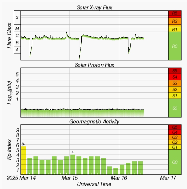 There are three main indicators that are tracked from the sun. Solar X-ray Flux, Solar Proton Flux and Geo-Magnetic activity. These charts were taken from the VK3FS website on space weather: https://3fs.net.au/space-weather/ They can also indicate the presence of aurora’s at the earth’s poles.