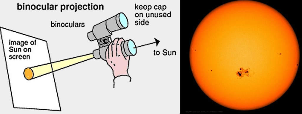The Australian Bureau of Meteorology suggests one method of observing sunspots by using a pair of binoculars, not by looking through them but by using the binoculars to focus an image of the sun onto a piece of paper located in the shade