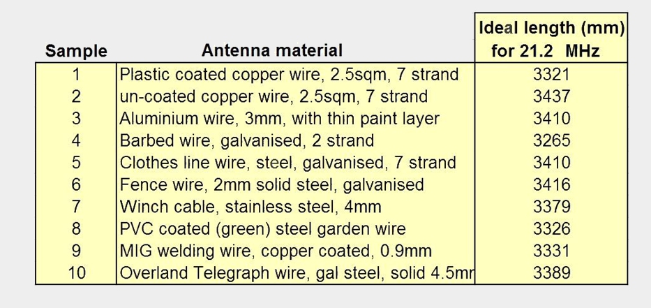 The antennas under test were all tuned for resonance on 21.2 MHz. The exact length for each antenna varied slightly due to metal and insulation materials.