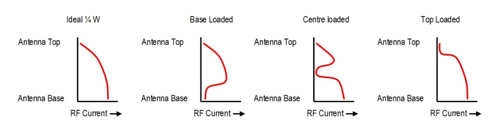 To the left we show the curve on a genuine quarter wavelength ground plane, with high current at the base and zero current at the tip. Where a base loading coil has been added to shorten the antenna, even though it is resonant, much of the premium RF radiated current is lost within the coil. A centre loaded antenna is somewhat better, but still a compromise.