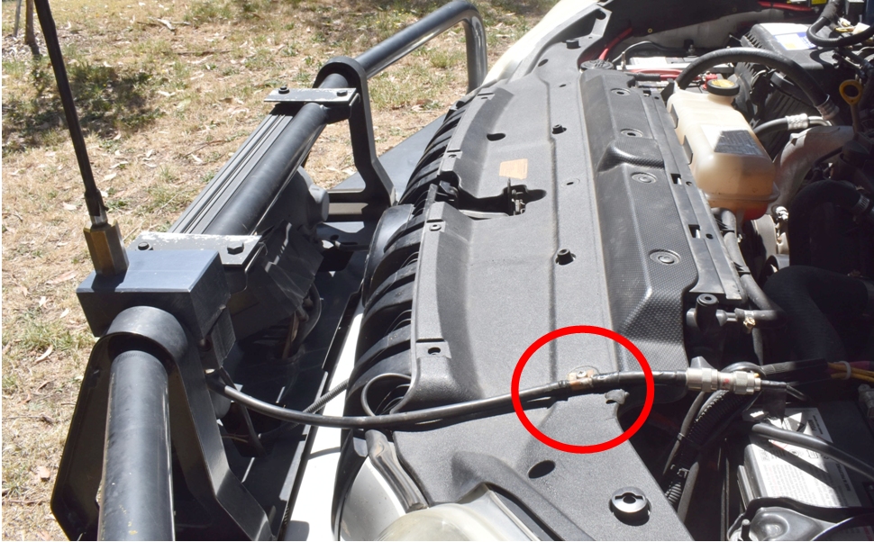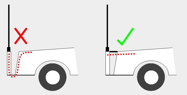In the sketch above we can see an example of a bad and better installation where electrical bonding between the body of the vehicle and the bull-bar has been added. This can be achieved with a copper strap or by bonding the coax braid to the vehicle close to the front, as shown (circled in red) below: