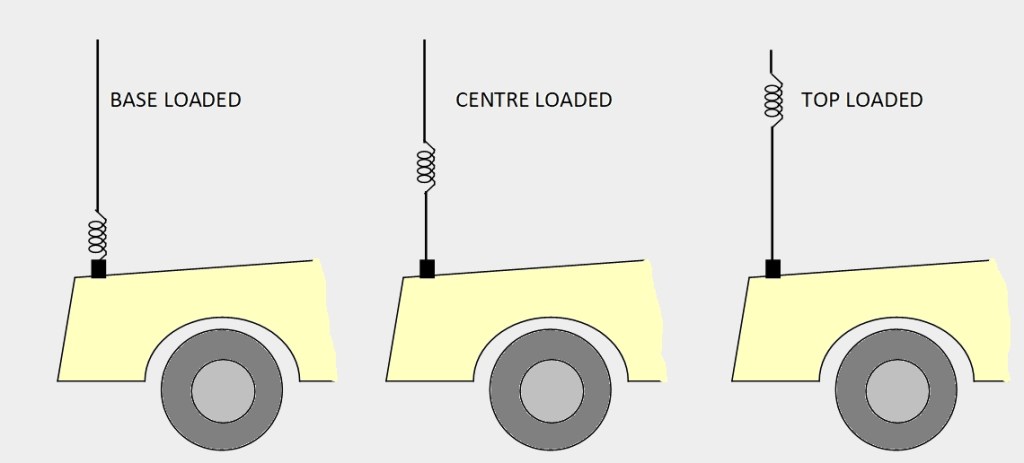 Placement of loading coils are another area of compromise. Antennas with a coil at the base, or ‘Base Loaded’ antennas are mechanically convenient because the weight and wind-loading of the coil is close to the vehicle, but unfortunately it will reduce the antenna performance.