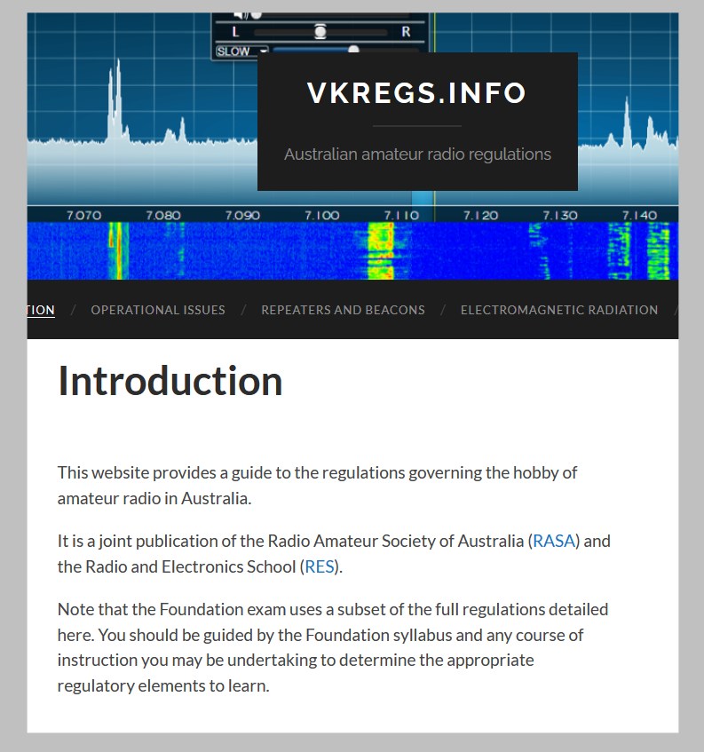 RASA has also produced a resource called VKREGS.INFO which brings together many of the regulations that define the use of Amateur Radio in Australia..