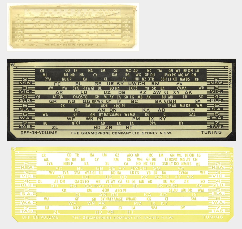 The image below shows the progression of scanning an original, but damaged AM receiver label, where digital image processing has been applied to clean it up to a near original condition where it can be laser printed onto polycarbonate film and be reintroduced to the radio with excellent results.