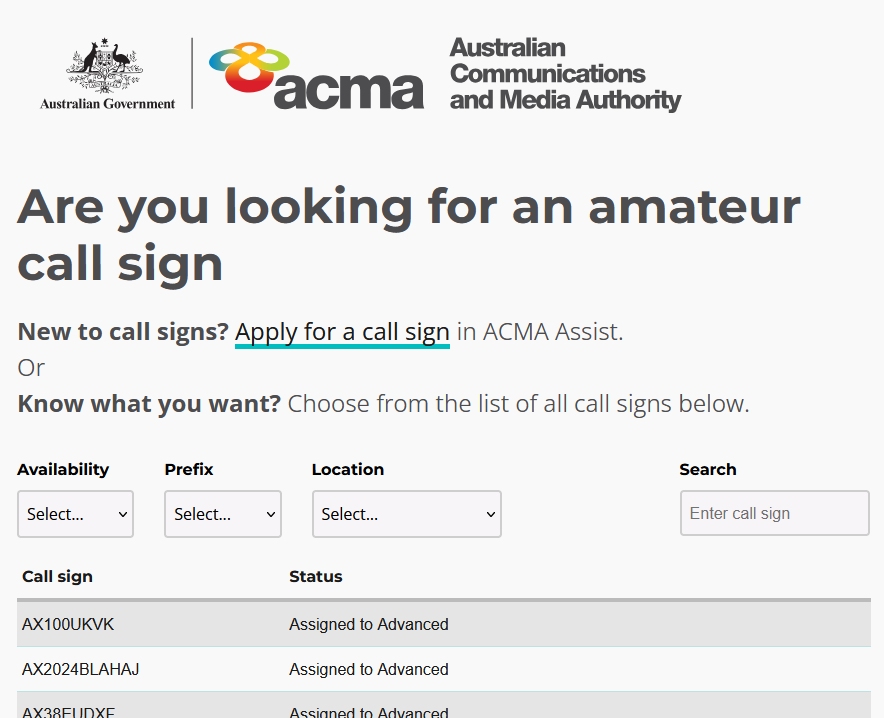 After a Recognition Certificate has been issued, candidates may then apply for a callsign. This callsign may be taken from a pool of the next available callsign, or by consultation with an ACMA database which can reveal if a given callsign is in use or available.