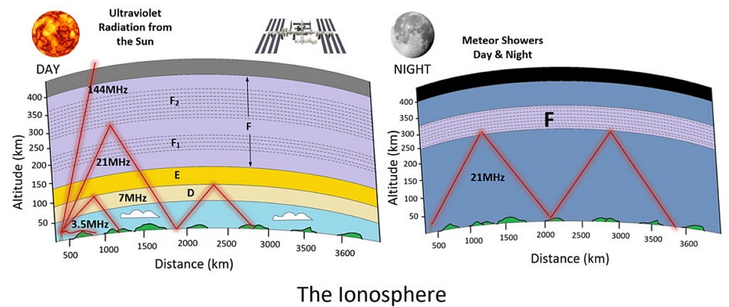 Recall that ionospheric propagation is dependent on time of day, season, frequency and solar activity.