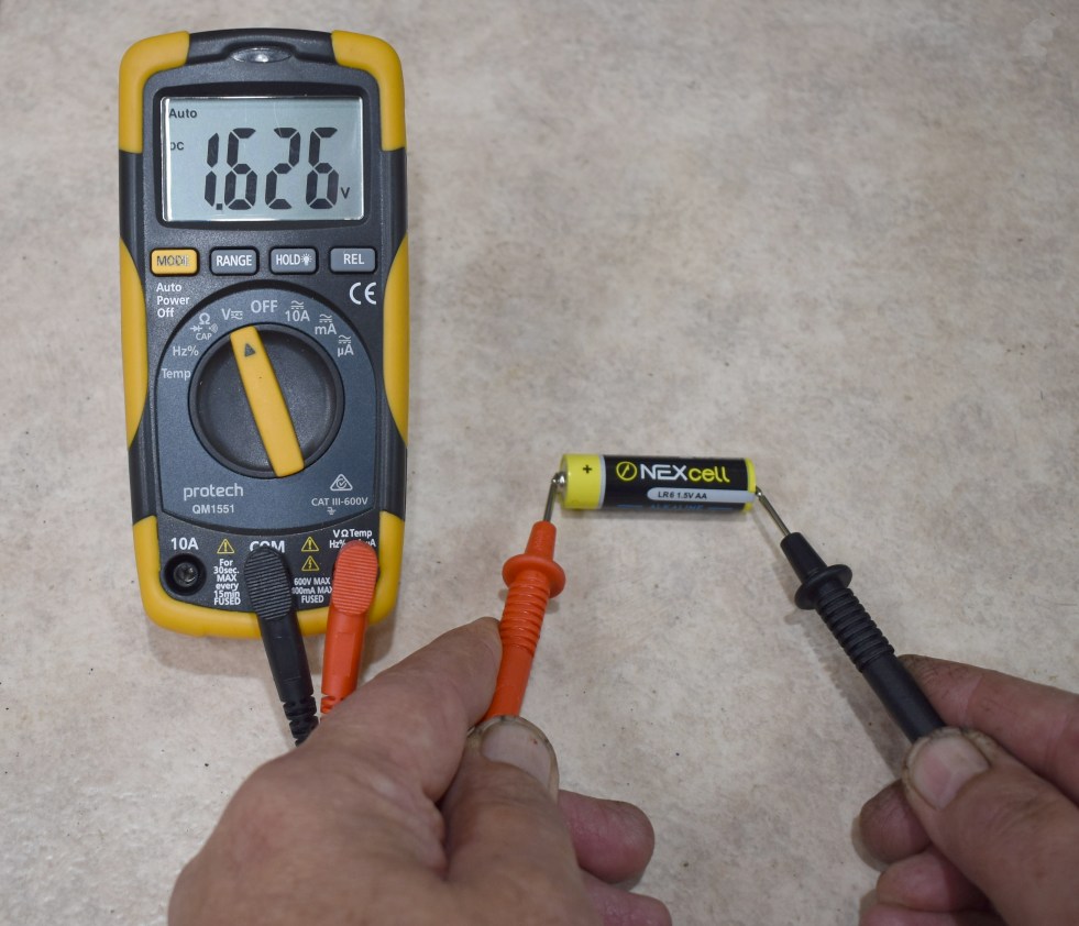 DC measurements are quite straightforward to perform. Set a multimeter to the DC Volts range and attach the two probes to a AA battery and most meters will automatically select the most appropriate range and reveal the battery voltage. A good cell should read around 1.5 to 1.6 volts.