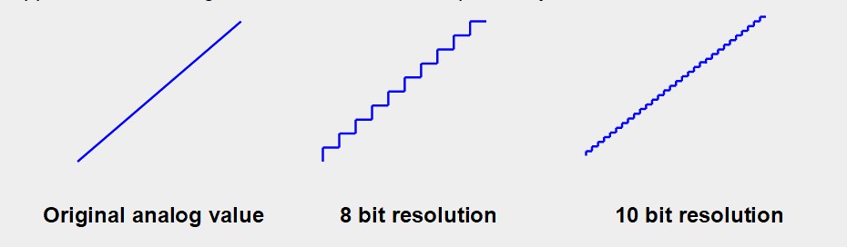 Microprocessors often need to read an analog sensor for measurements like temperature or light level. It uses a special stage called an A to D Converter, or ADC. This will convert a level to a number that will represent a voltage somewhere betweem zero and 5 volts. The quality or coarseness of the reading will depend upon how many bits of data are used to receive the conversion. 8 bits of data can express a voltage in a range from 0 to 255. If 10 bits of data are decoded, the resolution doubles twice to 1024 values for the same 0 to 5V range. This gives the reading a staircase effect.