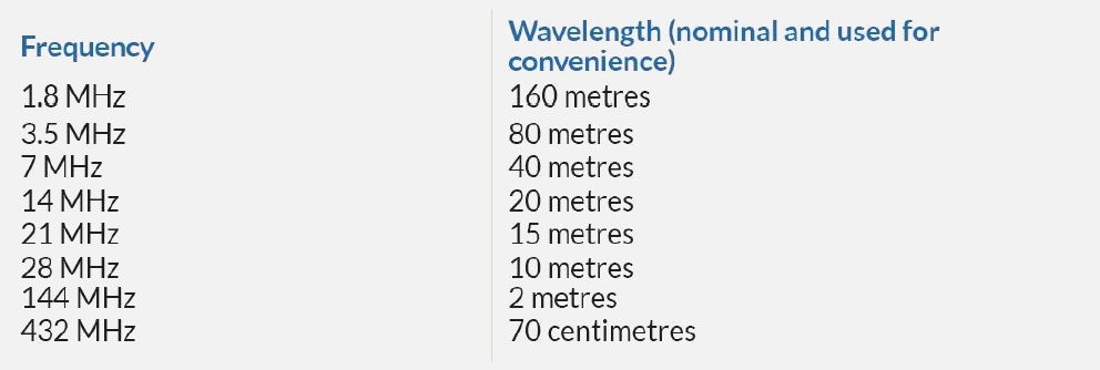 For example, on the 28 MHz band a full wavelength is 10 Metres. Therefore a half-wavelength dipole for that band is going to be approximately 5 metres long. The table below shows an approximation of Amateur frequencies and nominal wavelength.