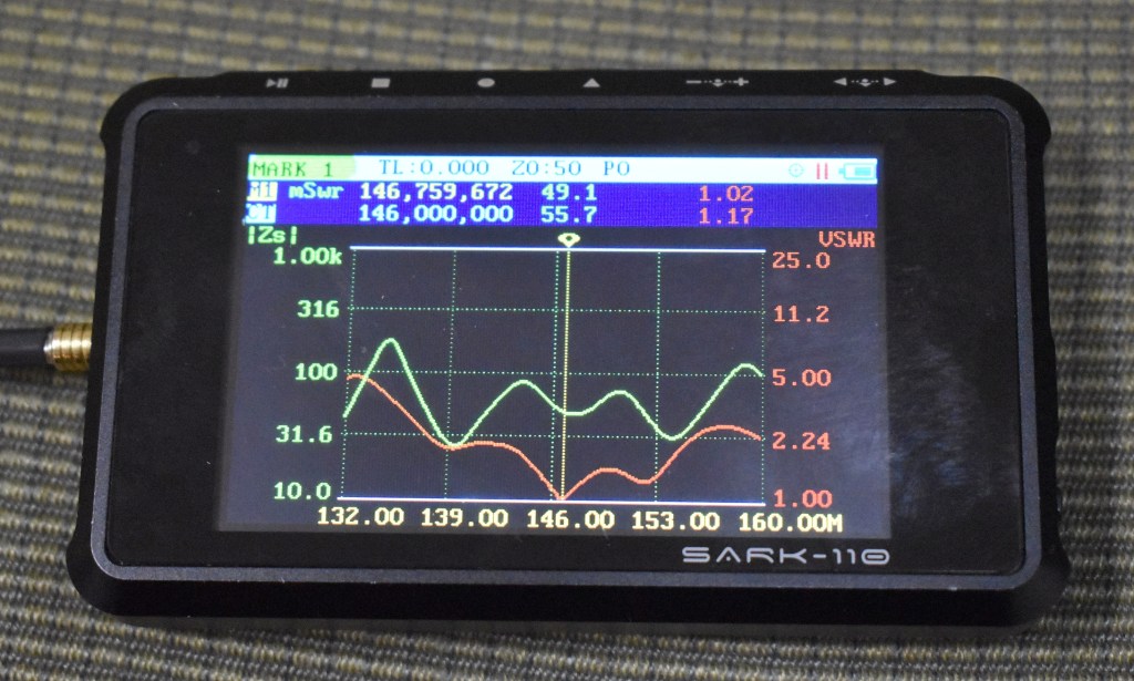 The image below shows a small Antenna Analyser testing a well matched vertical antenna on the 2 metre. There vertical yellow line represents the target frequency of 146.7 MHz. There are two curved lines. The green trace shows the impedance. On the target frequency, this is 49.1 Ohms, close to the ideal 50 Ohms. The red trace shows VSWR or Reflected Power. The trace dips close to zero reflected power at the target frequency. This is also ideal. The red trace is effectively showing where the antenna is resonant.