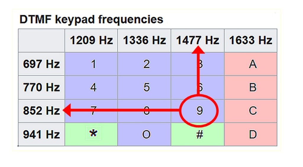 In this example, button 9 is pressed on a microphone and the tones 852 Hz and 1477 Hz are briefly transmitted (For as long as your finger is on the button). To determine what each button actually does, you need to consult details of the service you are attempting to use.
