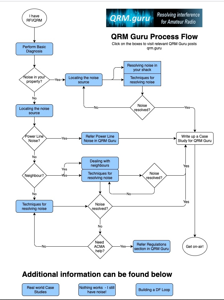 Tracking down interference sources is a learned skill worthwhile pursuing as an active part of the hobby. This page is only a summary of the art. Full details can be found on the qrm.guru website. A great place to begin is with the Tracking Process flowchart that can be found here: https://qrm.guru/qrm-guru-process/