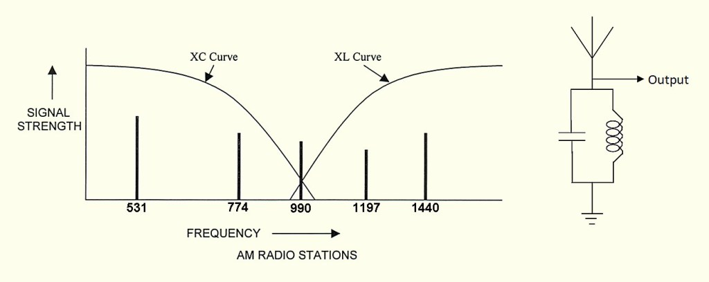 The same effect happens when you place a resistor and capacitor in parallel and place it across an antenna. There is an XC curve and an XL curve. One blocks the high frequencies, one blocks the lower frequencies and the signal that is most likely to get through for listening is where the two curve lines intersect.